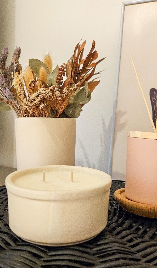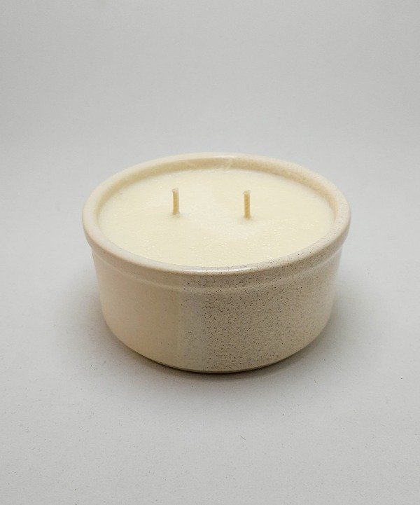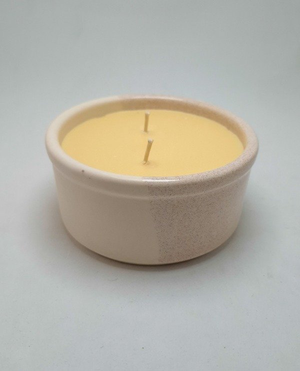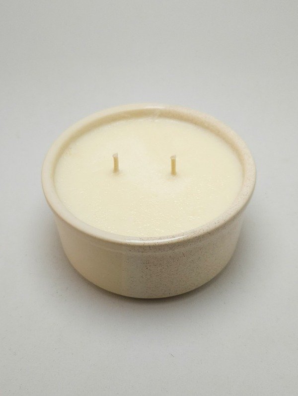 Vela de cera de soja en cuenco de cerámica re-utilizable.